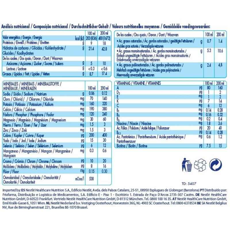 Dose diária recomendada: como suplemento de 1 a 3 embalagens dia. Como dieta exclusiva, em função das necessidades nutricionais do doente, segundo aconselhamento médico. Recomenda-se tomar frio. Conservar em local fresco e seco. Uma vez aberto, consumir por completo.