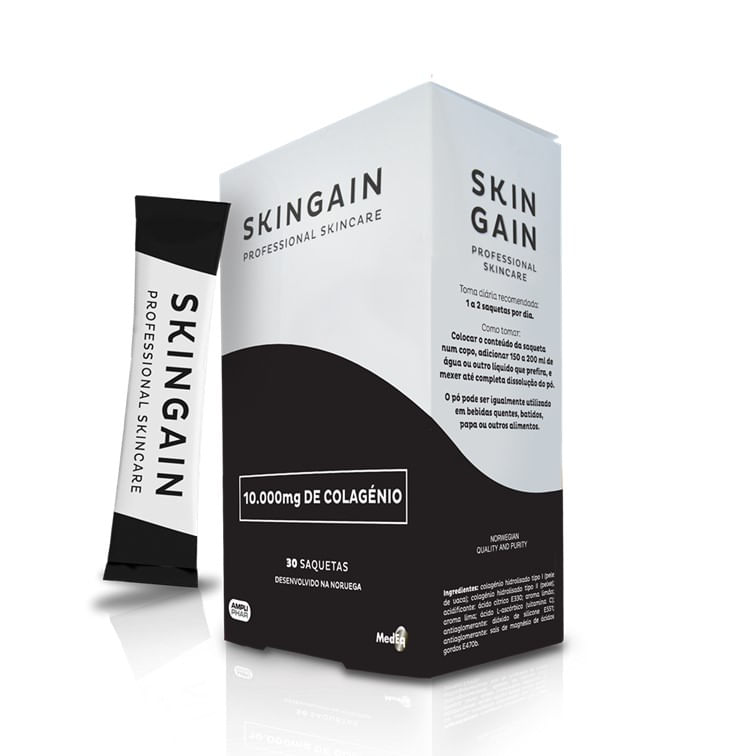 Suplemento alimentar com 10.000mg de colagénio tipo I e II e vitamina C, desenvolvido para retardar o processo de envelhecimento da pele.