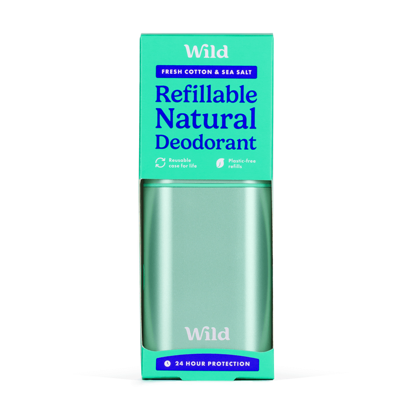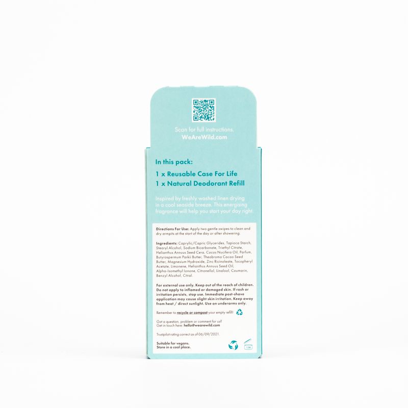 WILD, desodorizante natural, sem alumínio, 100% vegan e recarregável. Starter Kit composto pela Caixa e Recarga com aroma de Algodão Fresco e Sal Marinho. Reinventa a tua experiência no cuidado pessoal com os desodorizantes naturais WILD
